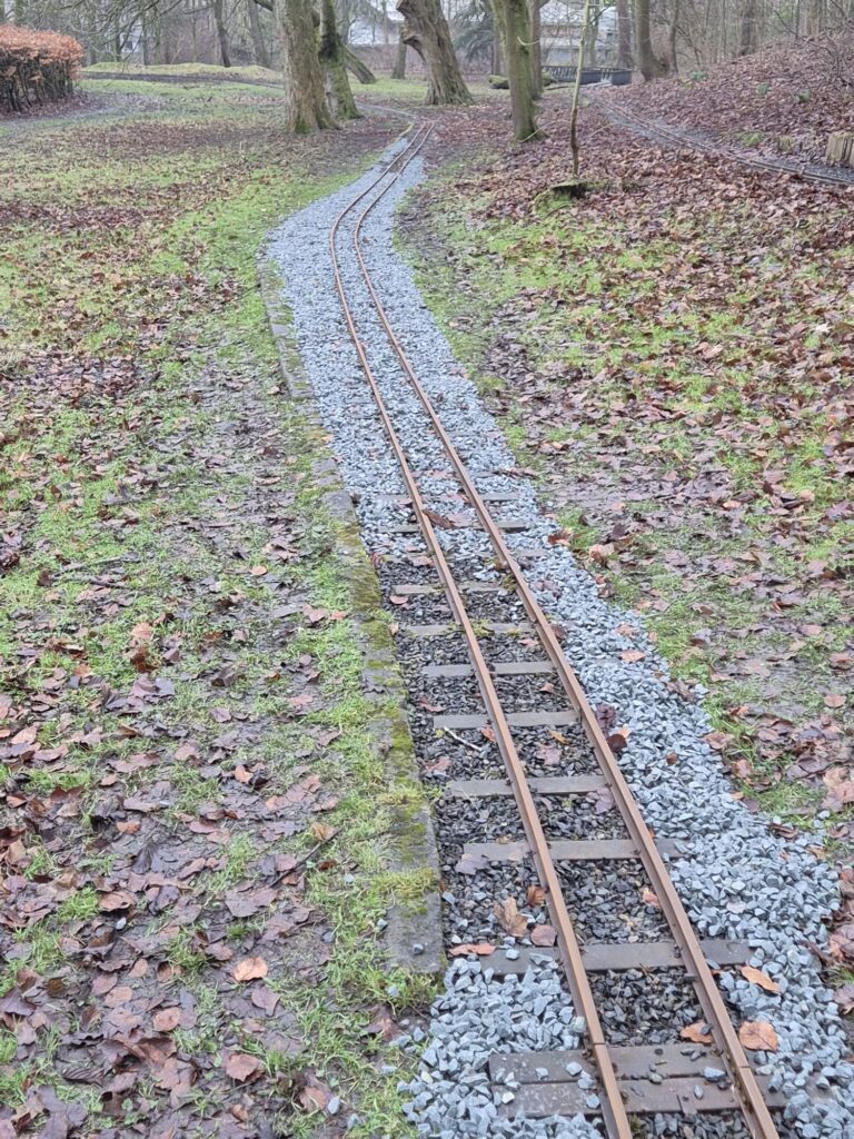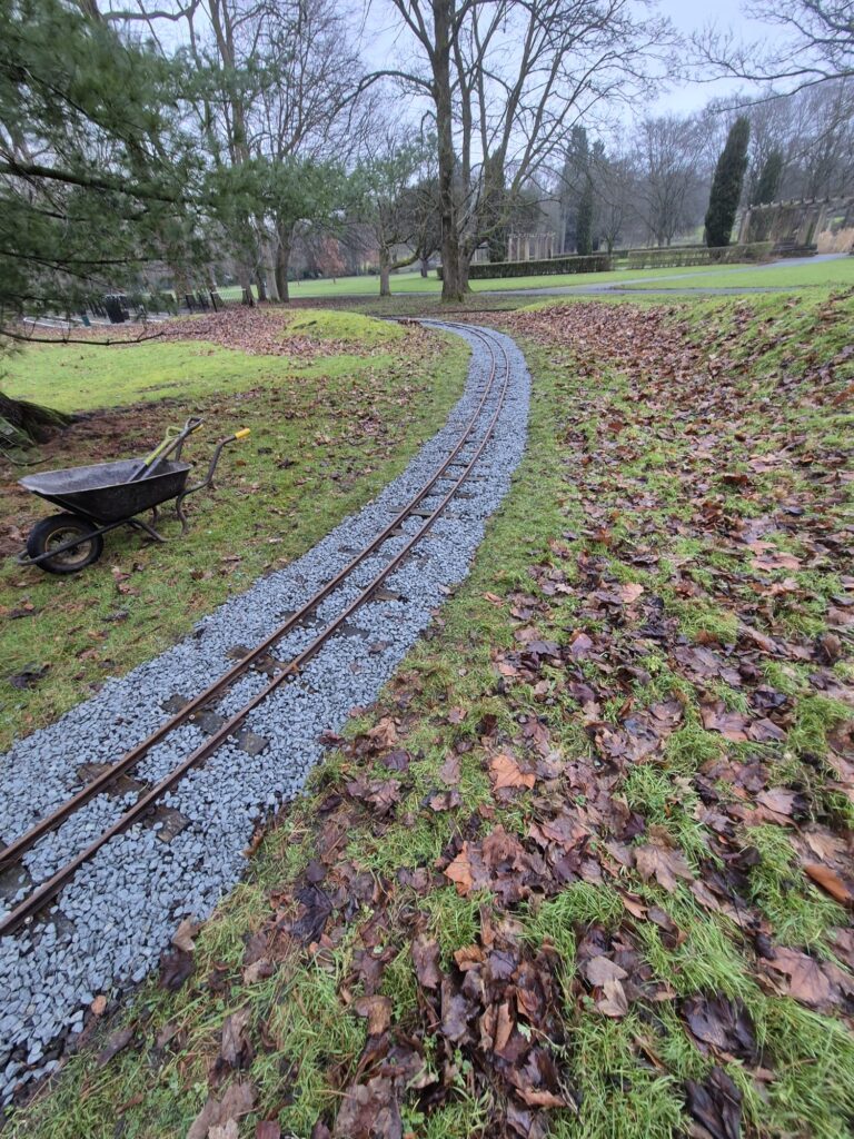 A lot of work has been directed at the track where recovery from some winter ravishes have been carried out. The soft earth persuades ballast in places to sink into the ground leaving sleeper ends in particular exposed. This in turn can lead to the track kinking out of alignment which had happened in 2 places. These kinks were straightened and a programme of building the ballast back up begun, we still have a lot to do but the following photos show areas that have been dealt with. Multi loads of ballast have been dropped so far in conjunction with John continuing his work trimming track edges back from grass encroachment. This work will continue.